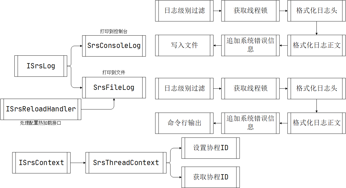SRS支持打印到console和file;支持设置level,支持连接级别的日志,支持可追溯日志;基类日志系统中定义了两个虚基类ISrsLog 和 ISrsContext,系统内的业务逻辑都是基于这两个接口实现的。