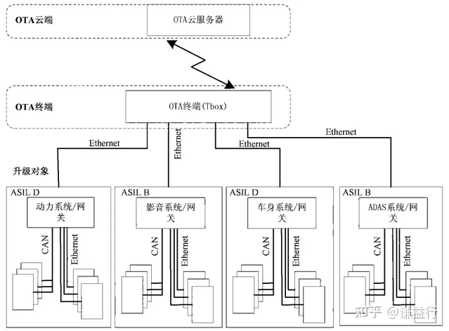 其中ota云平台需要支持CDN分发,补丁增量包分发、任务调度等等。终端T-box需要支持升级进度汇报、升级版本检查、升级通知等。通过汽车以太网向各个域控分发ota。而每个域控应该具备完善的ota接口